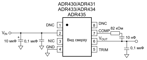 У источника опорного напряжения ADR43x имеется внешний вывод, который обеспечивает доступ к внутреннему узлу компенсации. Этот вывод допускает установку RC-цепи в критическую точку схемы (см. рис. 10).