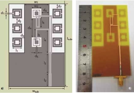 а) топология и геометрические параметры; б) внешний вид антенны с искусственным магнитным проводником