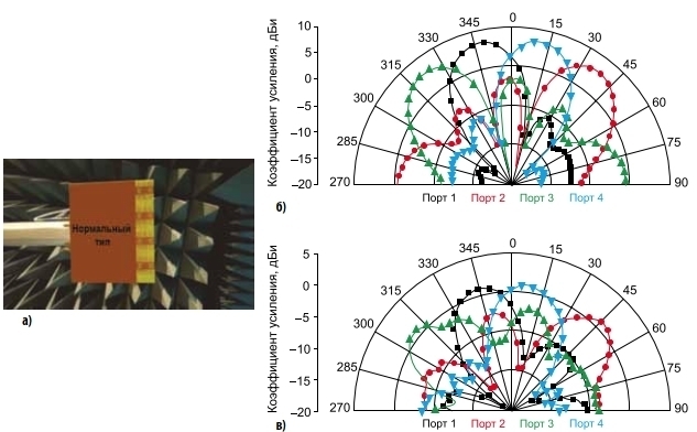 а) внешний вид интегрального антенного массива; б) смоделированная и в) измеренная диаграммы направленности в дальней зоне