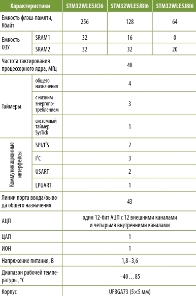 Модуль BLE тактируется частотой 8 или 16 МГц, а в режиме пониженного энергопотребления используется частота тактирования 32; 32,768 или 15 кГц. Допускается выключение питания модуля в режиме ожидания. Радиомодуль обеспечивает бюджет линии связи до 93 дБ. Чувствительность приемника составляет –90 дБм. Выходная мощность передатчика варьируется в пределах –18…3 дБм. При передаче сигнала потребление МК возрастает до 3,5 мА, а при приеме – до 2,2 мА.