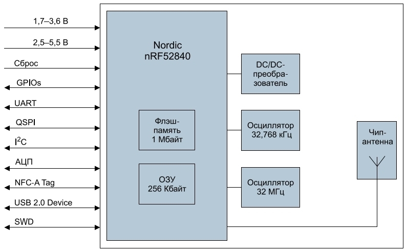 Компания Panasonic, как обычно, выпустила очередной беспроводный модуль. Структурная схема модуля приведена на рисунке 2. Он поддерживает стандарт Bluetooth 5 Low Energy и обеспечивает скорость передачи данных 2 Мбит/с. На этот раз для создания модуля использовалась беспроводная система-на-кристалле nRF5340 от Nordic Semiconductor, к которой добавили на плату DC/DC-преобразователь, два осциллятора и чип-антенну. О СнК nRF5340 довольно подробно рассказано в [1], поэтому мы не будем повторяться, а ограничимся перечислением основных параметров модуля PAN1780:
