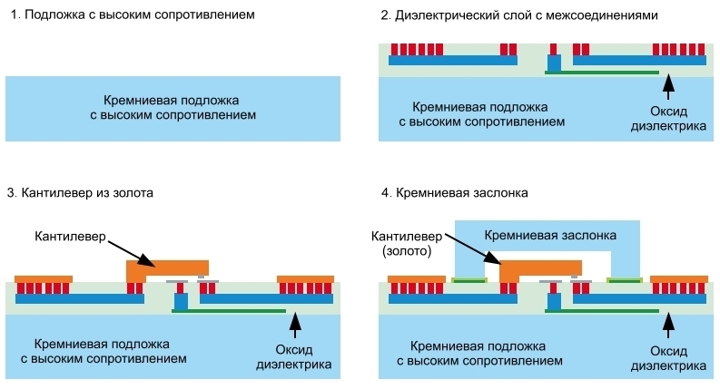Во многих смыслах МЭМС-коммутаторы схожи с механическими реле, однако выполнены в микрометровом масштабе. Контакт между входом и выходом обеспечивается с помощью кантилевера, который приводится в действие электростатической силой, а не магнитным полем. Для изготовления коммутаторов требуется стандартный производственный процесс, позволяющий наносить несколько слоев (см. рис. 3).