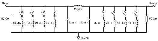 Комму таторы соединяют сосредоточенные индуктивные элементы с индуктивностью 15–30 нГн для регулировки частоты фильтра, в то время как низкое сопротивление RON сглаживает отрицательное дейс твие, оказываемое последовательным сопротивлением на добротность (Q) дросселей. Схема также обеспечивает согласование 50 Ом на входах и выходах во всех состояниях.