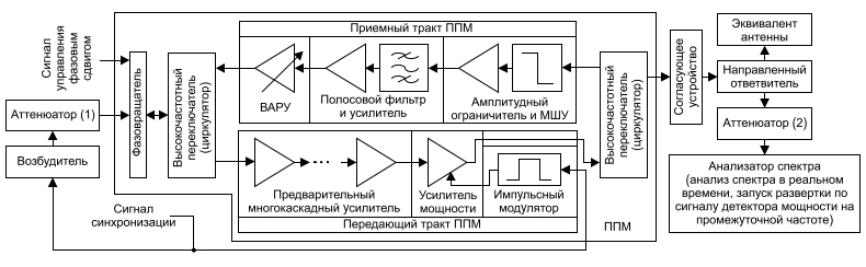Предлагаемая схема измерений представлена на рисунке 7. Контроль качества функционирования передающего плеча ППМ должен осуществляться непрерывно, поскольку воздействие помех по цепям питания может иметь отложенный эффект, особенно при корреляционной обработке принятых сигналов в РЛС. Если в качестве устройства анализа выходного сигнала используется другой ППМ, то он должен быть охвачен синхронизацией, а при необходимости – и другими опорными сигналами.