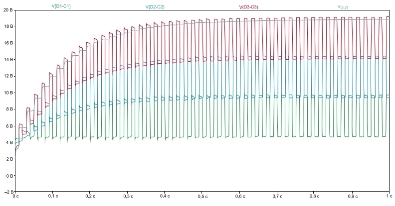 Результат моделирования в LTspice трехкаскадного зарядного насоса Диксона