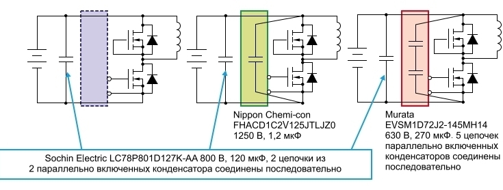В инверторах при очень крутых фронтах перек лючения, например при использовании карбидокремниевых ключей, применяется 2-каскадная схема снабберной цепи [1]. Ее пример приведен на рисунке 3, где указаны производители конденсаторов, типы конденсаторов и схема их включения. В этой схеме используются слюдяные конденсаторы компании Soshin Electric, пленочные конденсаторы компании Nippon Chemi-Con и керамические конденсаторы Murata.