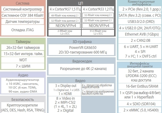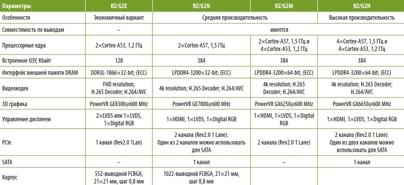 Компания Renesas Electronics в очередной раз пополнила свою производственную линейку микроконтроллеров (МК) семейством RZ/G2. Главным отличием нового многоядерного семейства является использование 64-бит архитектуры Arm v8-A с процессорными ядрами Cortex-A53 и Cortex-A57. МК нового семейства можно использовать во встраиваемых системах, для автоматизации зданий, на всех уровнях АСУ. На их основе можно создавать человеко-машинный интерфейс нового поколения. В состав семейства входят четыре группы МК. Их основные различия и параметры приведены в таблице 1. Одним из главных приложений МК этого семейства является человеко-машинный интерфейс с расширенными графическими возможностями. На рисунке 1 иллюстрируются графические возможности МК семейств RZ. Возможность МК семейства RZ/G2 управлять дисплеями 4K выгодно выделяет их из ряда конкурентов. Еще одним преимуществом рассматриваемых МК является долговременная поддержка платформы разработки Civil Infrastructure Platform (CIP) со временем обслуживания более 10 лет. Попутно заметим, что ядро CIP SLTS Linux поддерживает безопасность и уменьшает уязвимость системы. Структурная схема платформы разработки МК семейств RZ/G представлена на рисунке 2. В дальнейшем изложении мы, в основном, будем ссылаться на МК RZ/G2H с наибольшей производительностью. Однако основное отличие этого МК заключается в вычислительных возможностях, благодаря четырем ядрам Cortex-A57 и четырем ядрам Cortex-A53. Остальные различия не существенны. Ядра Cortex-A57 тактируются частотой 1,5 ГГц, а ядра Cortex-A53 – частотой 1,2 ГГц. Структурная схема МК RZ/G2H приведена на рисунке 3.