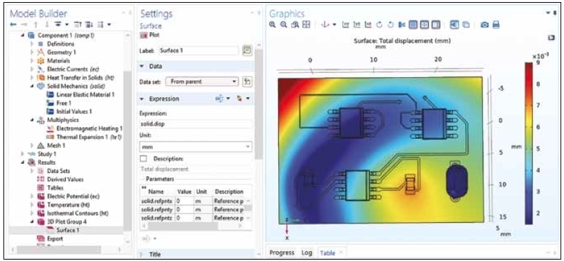 В статье рассматривается моделирование Джоулева нагрева и деформаций, вызванных тепловым расширением, при помощи средств программы COMSOL Multiphysics на примере трехмерной модели печатной платы, разработанной в редакторе PADS Layout системы Mentor Graphics. Описан экспорт модели из топологического редактора и ее импорт в COMSOL Multiphysics. Проведено исследование распределения электрического потенциала и температуры на поверхности платы, анализ нагрева печатных проводников и направления протекания тока.
