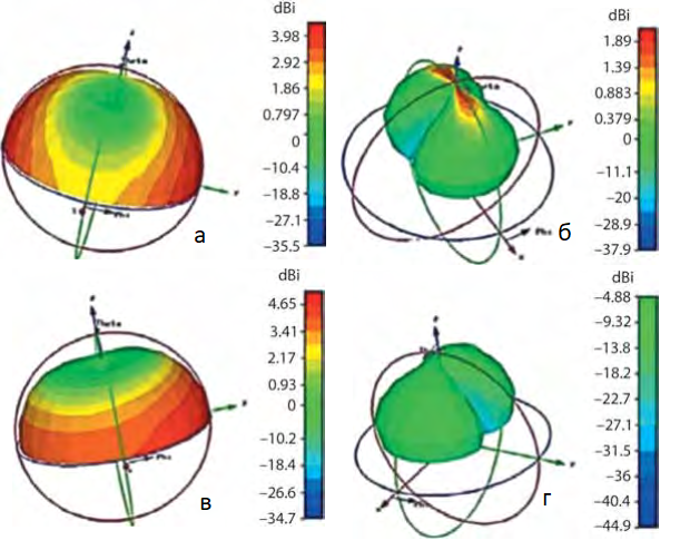 Диаграмма направленности а) и б) для частоты f1 = 0,9 ГГц, в) и г) для f2 = 1,8 ГГц