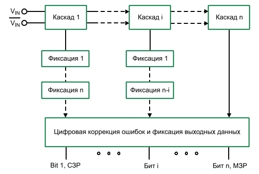 Число каскадов часто совпадает с числом разрядов АЦП. Конечный результат преобразования является совокупностью результатов каждой ступени. Такой процесс преобразования приводит к задержке данных всего лишь на несколько тактов, причем их число всегда меньше числа каскадов. Примером достижения высоких результатов может служить 2-канальный АЦП конвейерного типа ADS54J20 компании Texas Instruments. При разрешении 12 бит его производительность достигает 1 Гвыб/с.