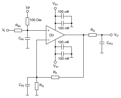 Следует определить необходимость в выходном развязывающем резисторе. При малых паразитных емкостных нагрузках (менее 5 пФ) Rs, как правило, не требуется. При большей паразитной выходной емкости можно обойтись без него, однако следует установить более высокий коэффициент усиления при замкнутой ОС.