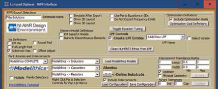 Для реализации проекта были выбраны модели индуктивностей Murata 06031QW18A и конденсаторов AVX 0603 ACCUP от Modelithics. Семейства реактивных компонентов были тщательно отобраны на основе характеристик на высоких частотах, а их обширный состав предоставил дискретным оптимизаторам в составе Microwave Office большой выбор компонентов для оптимизации. Состав моделей семейств включает возможность выбора таких элементов идеальных компенсаторов, чтобы физические размеры диплексера оставались в заданных пределах. Кроме того, имеется возможность выбрать индукторы и конденсаторы нескольких семейств, чтобы учесть большие различия в размерах элементов.