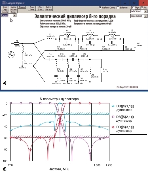 а) схема идеального 6-полюсного эллиптического дуплексера в FS; б) частотная характеристика в Microwave Office