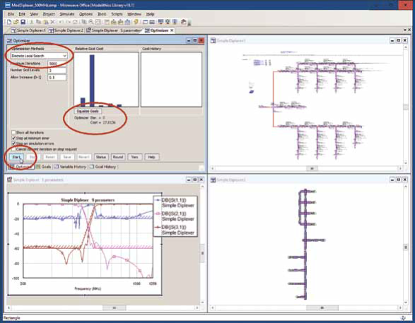 Чтобы запустить дискретный оптимизатор, выбираем Discrete Local Search в окне оптимизатора и нажимаем кнопку Start в левом нижнем углу. Константа оптимизации уменьшается в процессе поиска решения и принимает минимальное значение, когда дальнейшая оптимизация невозможна. Рекомендуется сделать более одного прогона оптимизации и использовать результаты, при которых константа оказывается наименьшей. Лучшие результаты после трех запусков оптимизатора показаны на рисунке 7 (обведенные области соответствуют элементам управления и месту отображения константы оптимизации). На графике S-параметров видно, что теперь кривые точнее соответствуют заданной оптимизации.