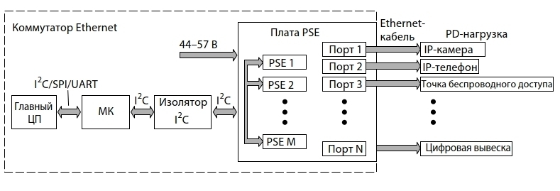 На рисунке 6 показана структурная схема самой распространенной PoE- системы. Микроконтроллер управляет PSE-оборудованием по интерфейсу I2C и связывается с центральным обрабатывающим модулем хоста по интерфейсам I2C, SPI или UART. Источник постоянного тока (44–57 В) подает питание на плату PSE и в PD-нагрузку по кабелям Ethernet.