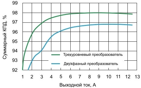 Пиковый КПД трехуровневого преобразователя достигает 98%. Этот преобразователь эффективнее двухфазного с теми же ограничениями по высоте компонентов и размерами GaN-ключей. Многоуровневая топология позволяет использовать тонкий дроссель с малой индуктивностью. Применение ключей eGaN не только позволяет уменьшить занимаемую площадь, но и повысить общую эффективность при более высоких коммутационных частотах.