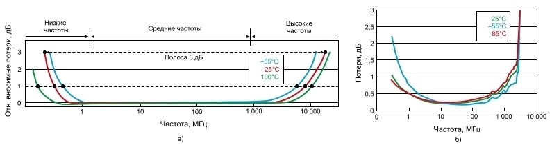 В реальном трансформаторе также имеется несколько паразитных элементов. Оно могут быть и собственными, и взаимными. На рисунке 2 показана модель неидеального трансформатора с сосредоточенными параметрами, а также паразитное сопротивление, индуктивность обмоток, резистивные потери в сердечнике и активная индуктивность намоток. Из-за паразитных связей полоса пропускания трансформатора сокращается, возрастают вносимые потери (см. рис. 3). Характеристики трансформатора также зависят от частоты, температуры и мощности. Нижняя частота среза определяется активной индуктивностью намотки, верхняя – емкостью намотки и емкостной связью между намотками.