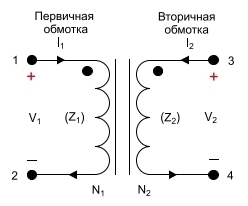 где i1, V1 и Z1 – ток, напряжение и импеданс в первичной обмотке; i2, V2 и Z2 – те же параметры вторичной обмотки; n1 и n2 – количество витков в первичной и вторичной обмотках, соответственно.