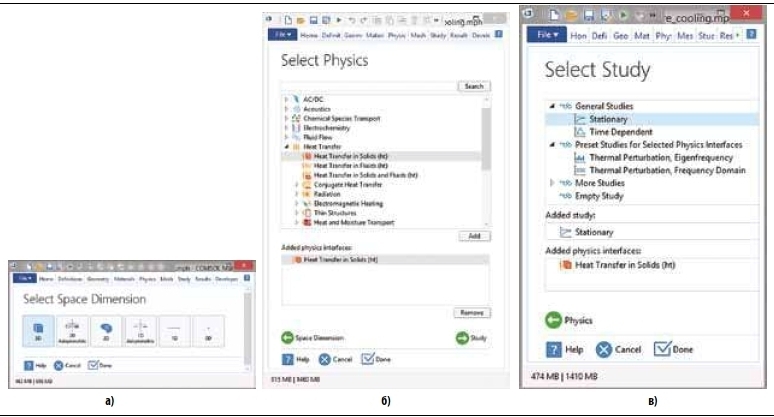 Мастер создания проекта COMSOL Multiphysics, окно: а) Select Space Dimension; б) Select Physics; в) Select Study
