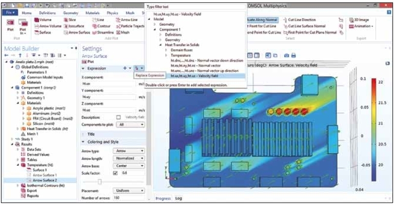 Настройка входных данных проекта COMSOL Multiphysics: а) определение глобальных параметров; б) импорт геометрии модели; в) выбор материалов из базы данных COMSOL, назначение материала Aluminum элементам модели и определение свойств алюминия; г) добавление в задачу источника тепла; д) определение свойств теплового потока; е) определение направления, давления, скорости движения воздуха в устройстве и других параметров текучей среды; ж) определение начального значения температуры компонентов модели; з) редактирование параметров теплопроводности печатной платы и ее компонентов; и) определение свойств расчетной сетки