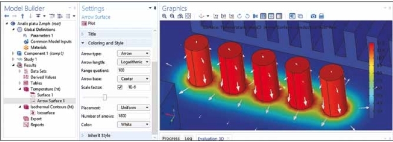 Для отображения направления распространения тепла в твердых элементах модели добавим стрелочную диаграмму (см. рис. 8), для чего воспользуемся командой Arrow Surface контекстного меню элемента Temperature из списка Results. Количество стрелок, их размер и цвет указываются в окне настроек диаграммы в полях Number of arrows, Scale factor и Color, соответственно.
